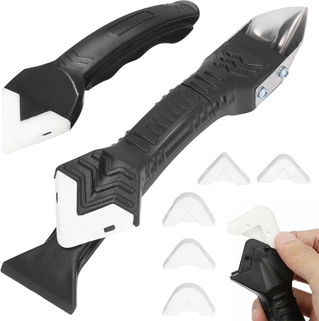 Der Schaber enthält fünf austauschbare Spitzen für Flexibilität bei der Entfernung von Silikon und Fugenkitt.