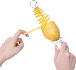 Bereichern Sie Ihre Küche mit effektvollen Spiral-Kartoffeln und -Gemüse. Der Schneider erzeugt dekorative Spiralen, die gleichmäßig garen und ihre Form hervorragend behalten. Einfach die Zutat auf den Spieß stecken, ein paar Mal drehen – fertig. Ideal für Partys zu Hause, zum Grillen oder für kreatives Anrichten.