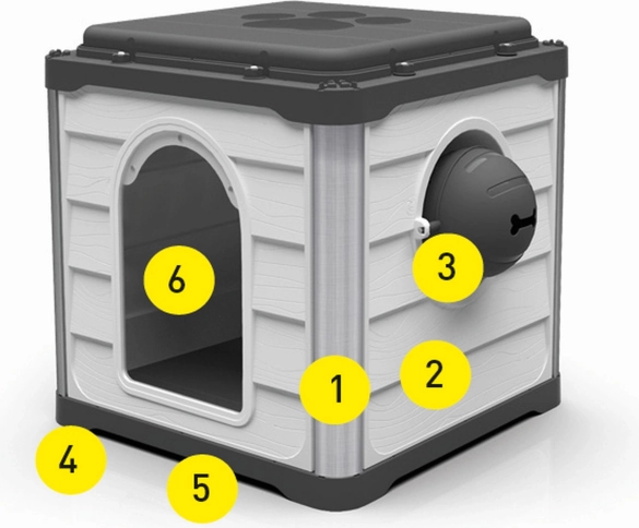 Dank des modularen Systems besteht es aus 6 Hauptteilen: einer Wand mit Eingang, einer Wand mit Futterspender, zwei Vollwänden sowie zwei Boden-/Dachteilen mit Drainagerillen für eine einfache Reinigung. Der Zusammenbau erfolgt schnell und ohne Werkzeug – ideal für den Einsatz zu Hause und auf Reisen.