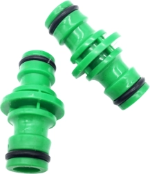 Die doppelte Konstruktion ermöglicht das sofortige Verbinden zweier Gartenschläuche ohne Werkzeug – einfach einklicken und losbewässern.