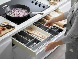 Mehrere Fachgrößen fassen Löffel, Gabeln, Messer sowie kleine Küchenhelfer, damit alles stets griffbereit ist.