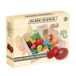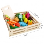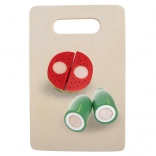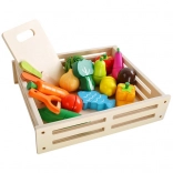 Segmentiertes Obst, Gemüse und Fisch lassen sich dank Klettverschlüssen mit dem Holzmesser leicht „schneiden“ und wieder verbinden. Tolles Training für die Feinmotorik und Rollenspiele.