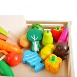 Entdecken Sie ein Holzset, das jedes Kinderkochen in ein unterhaltsames und lehrreiches Abenteuer verwandelt. Realistisch gestaltetes Obst, Gemüse und Fisch sind in Teile segmentiert und mit Klettverschlüssen verbunden, sodass Kinder sie sicher schneiden und wieder zusammenfügen können. Leuchtende Farben ziehen die Aufmerksamkeit auf sich und motivieren zum Entdecken von Formen und „Geschmäckern“.