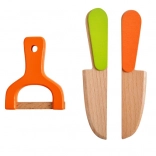 Im Set finden Sie 2 Messer, ein Schneidebrett und eine Schäl-Attrappe – Kinder können schälen, schneiden und servieren wie echte Köche.