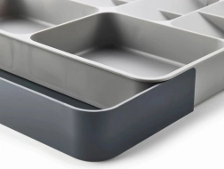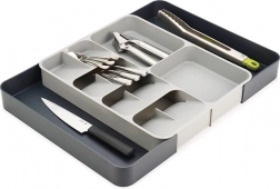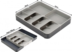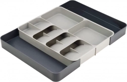 Dieser Küchen-Organizer aus grauem Kunststoff hilft Ihnen, Ordnung in Ihrer Schublade zu halten. Mit seinem anpassbaren Design und praktischen Fächern ist er ideal für die Aufbewahrung von Küchenutensilien.