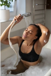Die Halterung ermöglicht die Einstellung des Winkels und der Richtung, sodass das Wasser genau dorthin geleitet werden kann, wo es für perfektes Spülen oder sanfte Massagen benötigt wird.