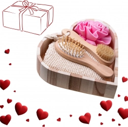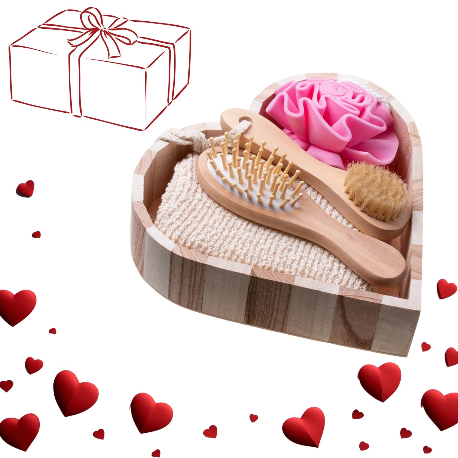 Dieses 5-teilige Spa-Set im dekorativen Holzherz bietet ein vollständiges Körperpflege-Ritual – von der Exfoliation über die Massage bis hin zu Aufschäumen und Reinigung. Die Holzausführung wirkt natürlich und stilvoll, ideal als Geschenk und als Bad-Accessoire.