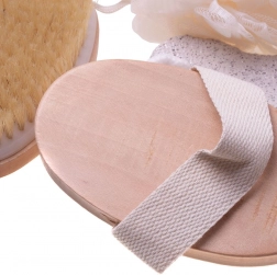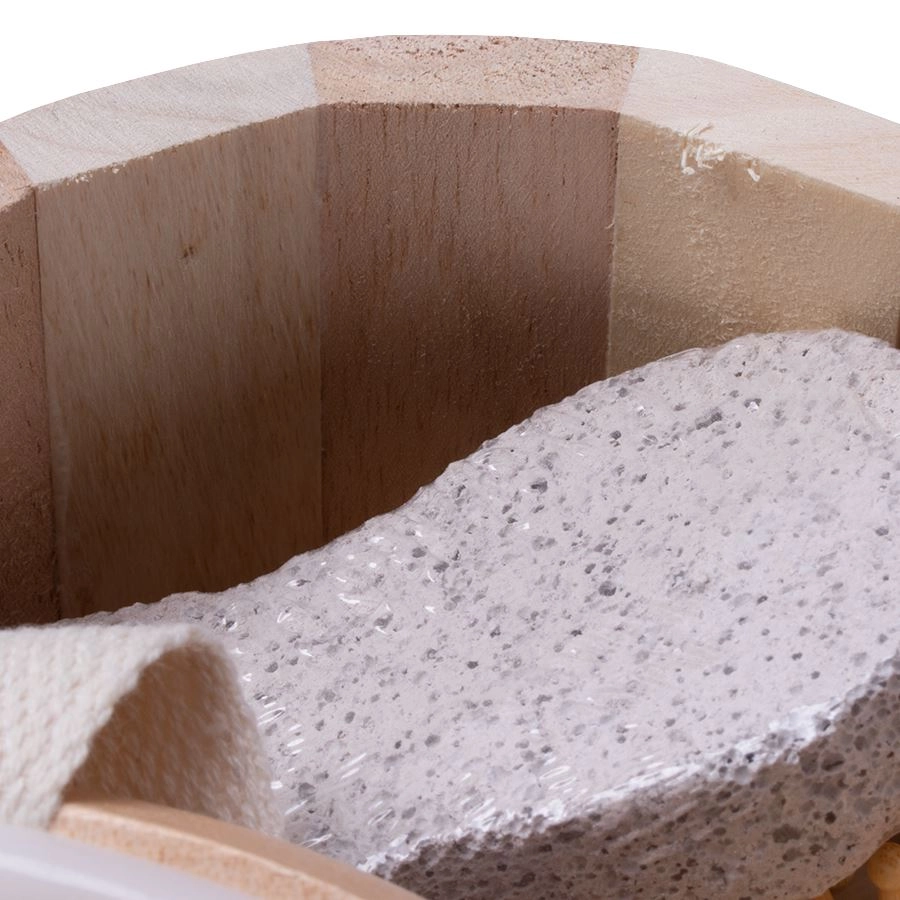Die Massagebürste mit Holzknötchen, die sanfte Bürste und der Bimsstein helfen, verhornte Haut zu entfernen und die Zirkulation zu unterstützen.