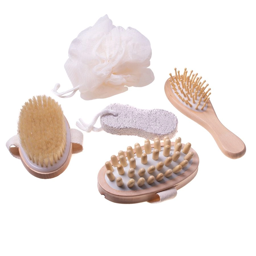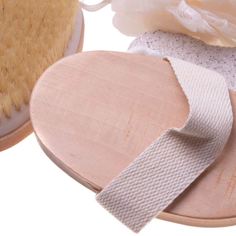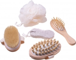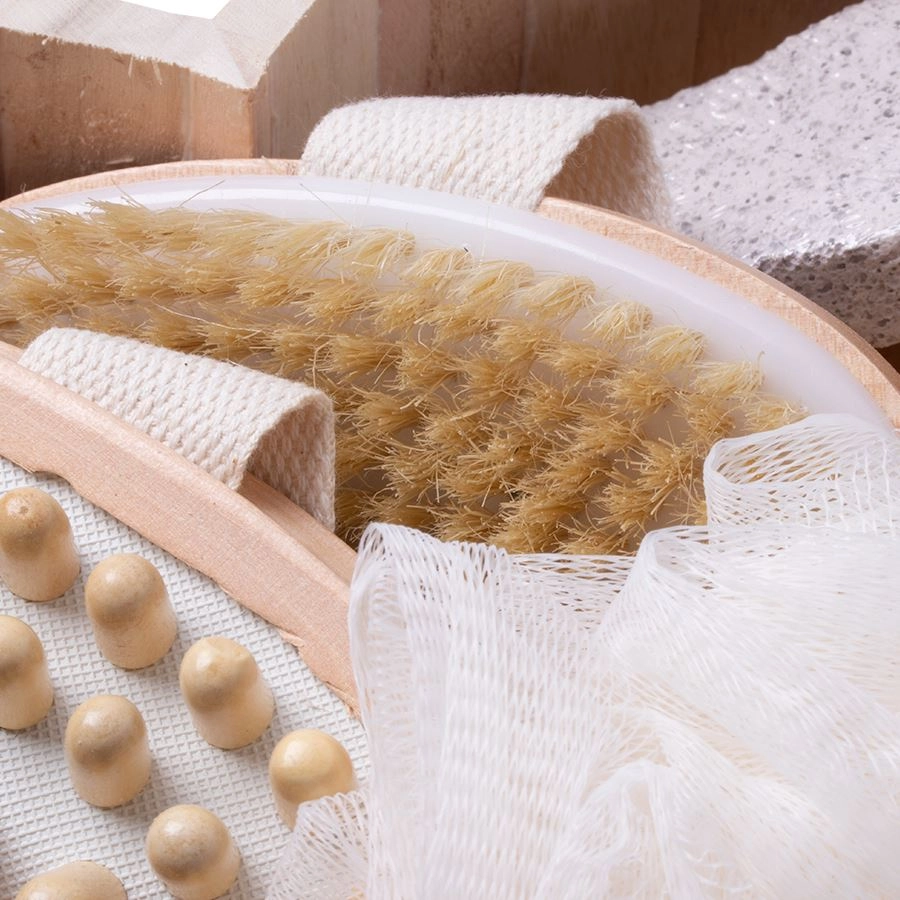 Von der Haarbürste bis zum Bimsstein – dieses Set deckt Reinigung, Massage und Exfoliation für eine glatte und frische Haut ab.