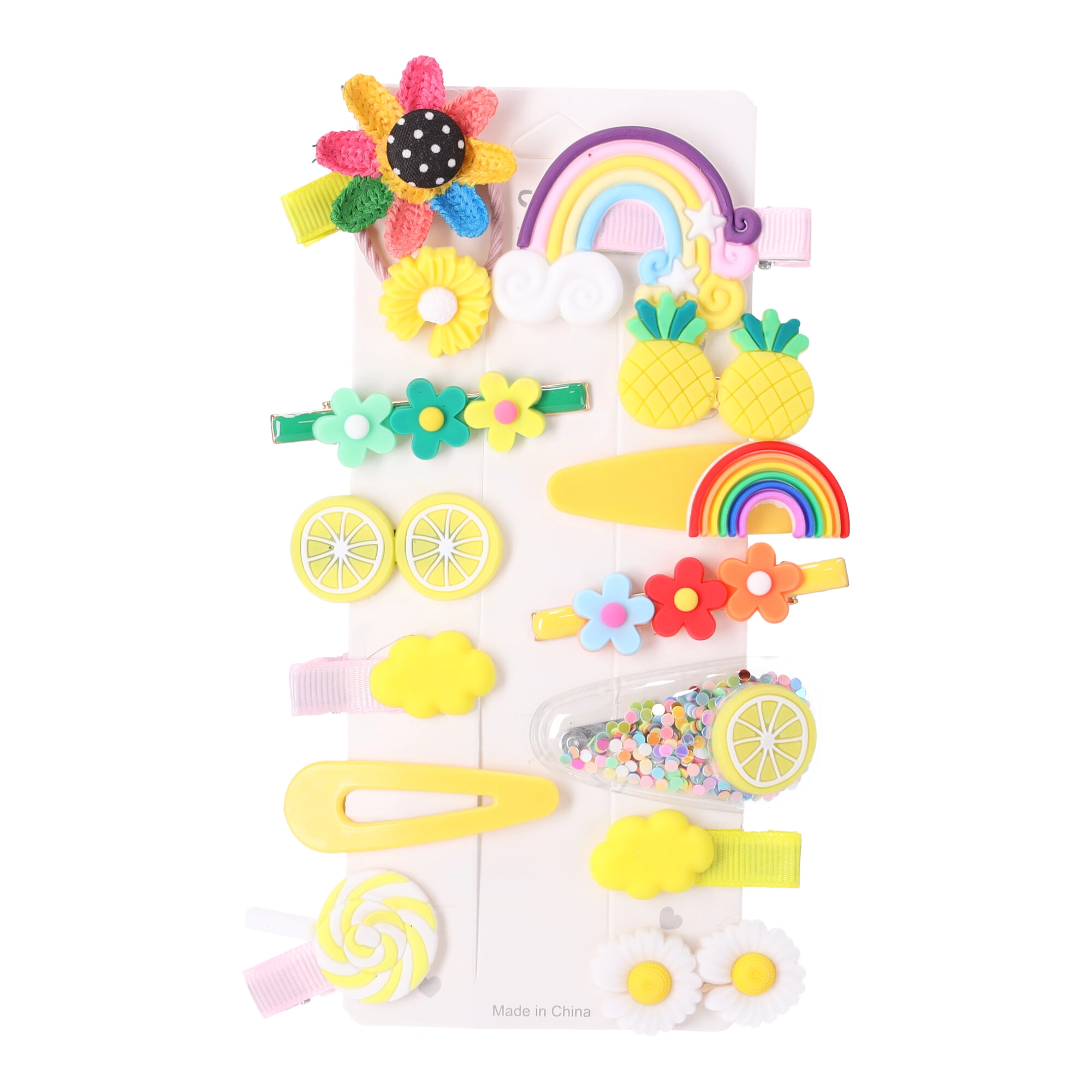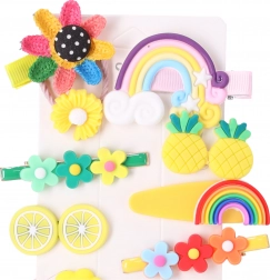 Das 14er-Set bietet Blumen, Regenbögen, Früchte und Wölkchen in pastelligen und glitzernden Tönen. Lässt sich leicht mit Kleidung und Anlass abstimmen.