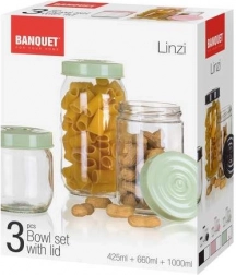 Das 3er-Set LINZI Dosen mit einem Volumen von 425 ml, 660 ml und 1000 ml kann praktisch für alle Lebensmittel verwendet werden, egal ob Gewürze, Nudeln oder Zucker. Die Glasdose hat einen dicht schließenden Deckel in Granitoptik.