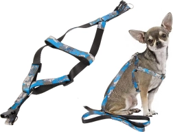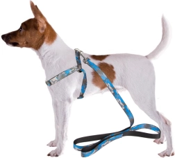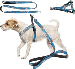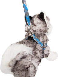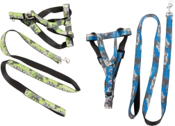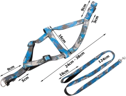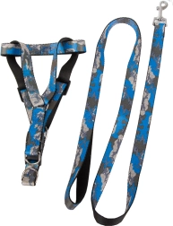 Die Länge des Geschirrs lässt sich dank verstellbarer Kunststoffschnallen leicht anpassen, und die Leine lässt sich dank Metallkarabiner im Handumdrehen an- und abkoppeln. Der rutschfeste Griff sorgt auch bei längeren Spaziergängen für einen sicheren Halt. Das Set ist ideal für kleine und mittelgroße Rassen und ist in modernem Camouflage-Design in Blau oder Grün erhältlich.