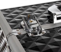 Die Kombination aus schwarzem und silbernem Metall mit geometrischen Mustern verleiht dem Koffer ein modernes Aussehen und gewährleistet zugleich seine Robustheit.