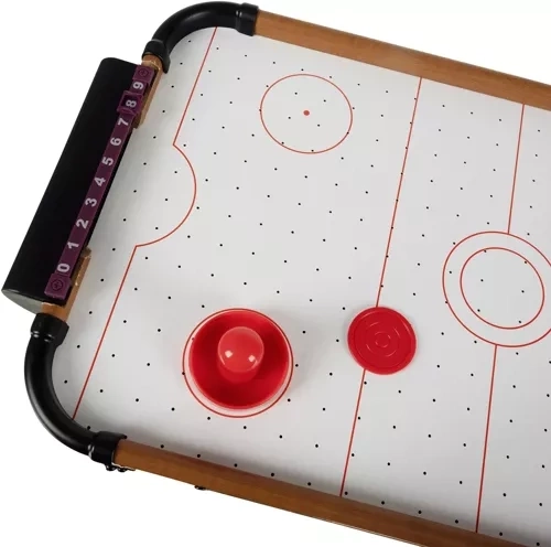 - TISCHVERSION DES SPIELS - die attraktive Version des beliebten Airhockeys ermöglicht es Ihnen, jederzeit und zu Hause Spaß zu haben. Sie bietet jede Menge Spannung. Das Airhockey-Set besteht aus einem Tisch, 2 Schlägern, 2 Pucks und 2 Toren. Das Arcade-Spiel ist eine fantastische Möglichkeit, Zeit zu verbringen – sowohl für Kinder als auch für Erwachsene. Es sorgt für Nervenkitzel und Spannung.