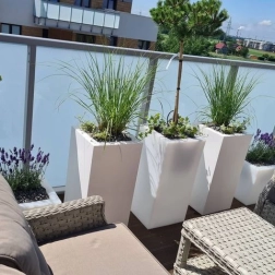 Sie werden zu einer eleganten Dekoration für das Wohnzimmer, einem Designer-Accessoire für das Büro oder einem modernen Element auf der Terrasse. Für die Pflege genügt es, den Blumenkübel mit einem feuchten Tuch und Seife abzuwischen.