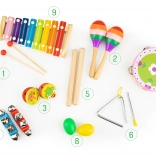 Das Set umfasst beliebte Percussion-Instrumente – von Tamburin und Triangel bis zu Maracas und Zimbeln – die Koordination von Hand und Auge, Konzentration und Kreativität fördern. Die sichere Ausführung ohne scharfe Kanten und die strapazierfähigen Materialien gewährleisten eine lange Lebensdauer.