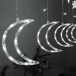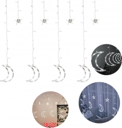 Dekorative LED-Lichter in Form von Mond und Sternen sind das ideale Accessoire für Ihre Wohndekoration während festlicher Zeiten. Diese Lichter schaffen eine gemütliche Atmosphäre und eignen sich perfekt zur Dekoration von Häusern, Wohnungen oder als wunderschöner Hintergrund für Weihnachtsfotos. Die Dekoration umfasst 4 Monde und 4 Sterne an der Kette, die dank ihrer Flexibilität überall aufgehängt werden können.