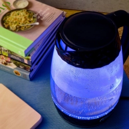 Dieser Wasserkocher hat eine elegante Glasstruktur mit LED-Beleuchtung, die ihm ein modernes Erscheinungsbild verleiht.
