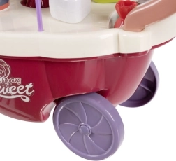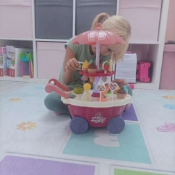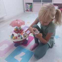 Schenken Sie Kindern ihre eigene Eisdiele! Der bunte Eiswagen mit Lichtern und Melodie bietet viele Möglichkeiten für das Verkäufer-Spiel. Im Set sind Eiskugeln, Eis am Stiel, Lutscher, ein Becher, ein Löffel und „Münzen“ zum Üben des Bezahlens enthalten. Das drehbare Etagen-Display (360°) präsentiert die süßen Leckereien ansprechend.