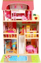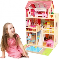 Das große Holzpuppenhaus von ECOTOYS bietet 3 Etagen und 6 Zimmer, LED-Beleuchtung für eine zauberhafte Atmosphäre und 16 Stück Holzmöbel. Die stabile und sichere Konstruktion ist ideal für Kinder ab 3 Jahren und fördert Fantasie, Kreativität und Feinmotorik. Inklusive Spielmatte mit Poolmotiv für noch mehr Spielspaß.
