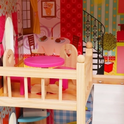 Verwandeln Sie das Kinderzimmer in eine Welt voller Fantasie. Dieses geräumige Holzpuppenhaus verfügt über 3 separate Ebenen und 6 verschiedene Räume in freundlichen Farben, die zu langem Spielen mit Puppen einladen. Der LED-Streifen beleuchtet das Innere stimmungsvoll und sorgt auch abends für eine magische Atmosphäre.