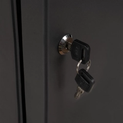 Der Schrank wird mit den mitgelieferten 2 Schlüsseln abgeschlossen. Vorgebohrte Löcher und ein Montageset (Dübel und Schrauben) ermöglichen eine schnelle Befestigung an der Wand.