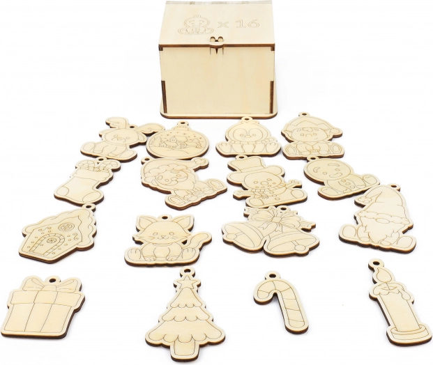 Holz-Weihnachtsmagnete, 16 Stk. Ausmalbar, mit Aufhängeöse, in einer Holz-Geschenkbox. Kreative Deko für Kühlschrank und Weihnachtsbaum.