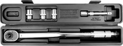 Der Werkzeugkörper besteht aus Chrom‑Vanadium‑Stahl (Cr‑V), der sich durch hohe Festigkeit und lange Lebensdauer auszeichnet. Der gerändelte Griff liegt gut in der Hand und erleichtert einen sicheren Halt, die gravierte Skala verbessert die Ablesbarkeit der Einstellung. Alles verstauen Sie übersichtlich im robusten Koffer, sodass das Set stets einsatzbereit ist.