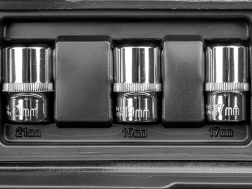 Der praktische Koffer hält alles an seinem Platz. Im Set finden Sie die drei gängigsten Stecknüsse 17/19/21 mm sowie eine Verlängerung für einfachen Zugang.
