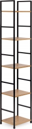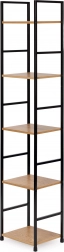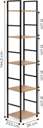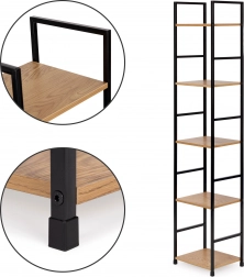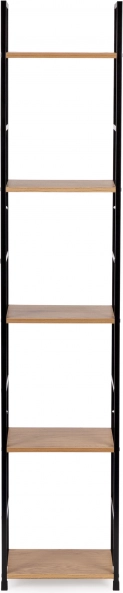 Dieses moderne Regal im industriellen LOFT-Stil eignet sich ideal für kleinere wie größere Interieurs. Das schmale Design spart Platz, während fünf Ablagen ausreichend Fläche für Bücher, Deko, Pflanzen und Badaccessoires bieten. Der pulverbeschichtete Metallrahmen sorgt für Stabilität und Langlebigkeit, die MDF-Ablagen mit Holzdekor verleihen eine warme, natürliche Optik.