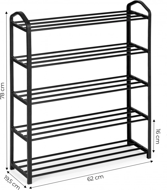 Dieses Metall Schuhregal ist die perfekte Lösung für Ihren Flur, die Umkleide oder sogar das Büro. Fünf Regale ermöglichen die Aufbewahrung von bis zu 15 Paar Ihrer Lieblingsschuhe und die leichte Konstruktion sorgt für Stabilität auch bei voller Belastung.
