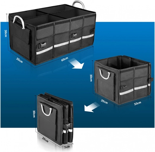 Bringen Sie dauerhaft Ordnung in Ihren Kofferraum. Dieser geräumige Kofferraum-Organizer mit Deckel bietet ein Volumen von 60 l, ein wasserdichtes Material und zahlreiche Taschen für die übersichtliche Aufbewahrung von Werkzeug, Zubehör und Einkäufen. Dank der stabilen Griffe und der faltbaren Konstruktion lässt er sich leicht tragen und platzsparend verstauen, wenn er gerade nicht gebraucht wird.
