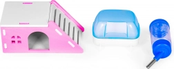 Enthalten sind Häuschen, Schale, Trinkflasche, zwei Rutschen, vier Ebenen und ein Laufrad – alles, was Ihr Haustier für Komfort, Aktivität und Erholung braucht.