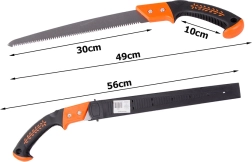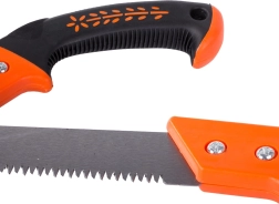 Praktische Gartensäge für schnelles und präzises Auslichten von Ästen. Bietet eine robuste Klinge, einen ergonomischen, rutschfesten Griff und ein Schutzholster mit Gürtelschlaufe für sicheres Tragen und einfache Handhabung im Garten und Obstgarten.