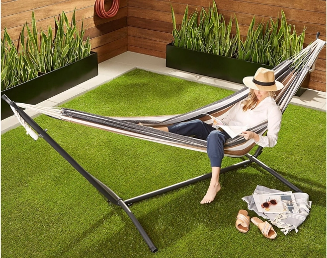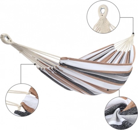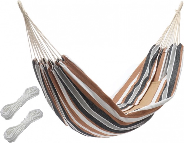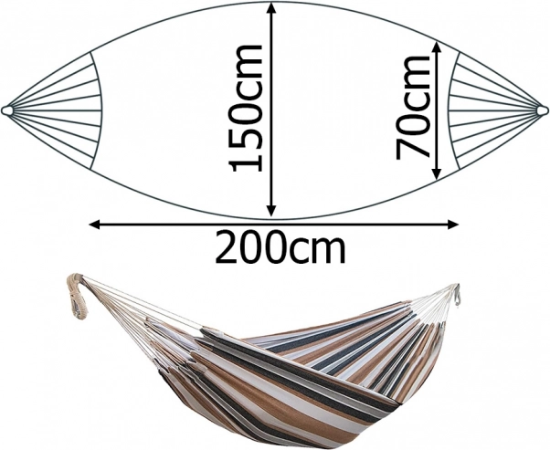 Die breite Liegefläche von 200 × 150 cm bietet Komfort für eine oder zwei Personen. Dicht gewebte Aufhängeschnüre verteilen das Gewicht gleichmäßig für ein stabiles und sicheres Schaukeln. Der atmungsaktive Stoff ist angenehm auf der Haut und leicht zu pflegen – maschinenwaschbar.
