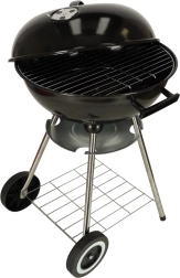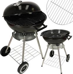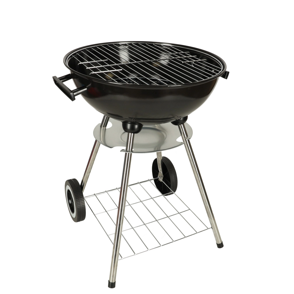 Das durchdachte Design umfasst einen verchromten Grillrost mit 41 cm Durchmesser, einen separaten Brennstoffrost mit 32 cm, einen praktischen Aschebehälter und eine untere Ablage für Kohle und Zubehör. Dank bequemer Griffe und Transportrollen lässt sich der Grill leicht auf die Terrasse oder in den Garten bewegen.