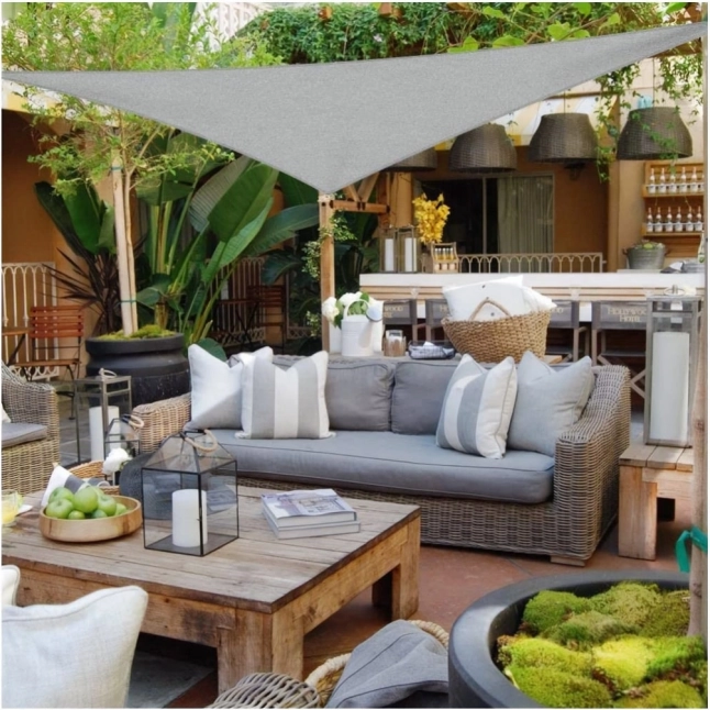 Das dreieckige Segel 3 × 3 × 3 m sorgt für angenehmen Schatten für Sitzecke, Essbereich und Kinderspiele und schützt wirksam vor schädlicher UV-Strahlung.