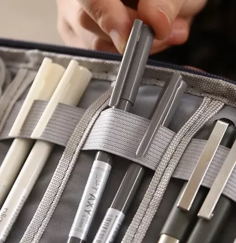 Innen finden Sie 6 Netztaschen für schnellen Überblick und 8 elastische Bänder zur festen Fixierung des Zubehörs. Der Reißverschluss schützt den Inhalt, die Schaumstoffpolsterung dämpft Stöße, und der Handgelenkriemen erleichtert das Tragen. Geeignet für Arbeit, Studium und Reisen.