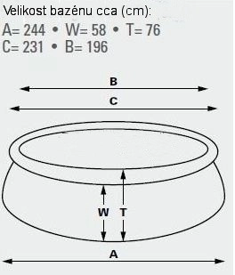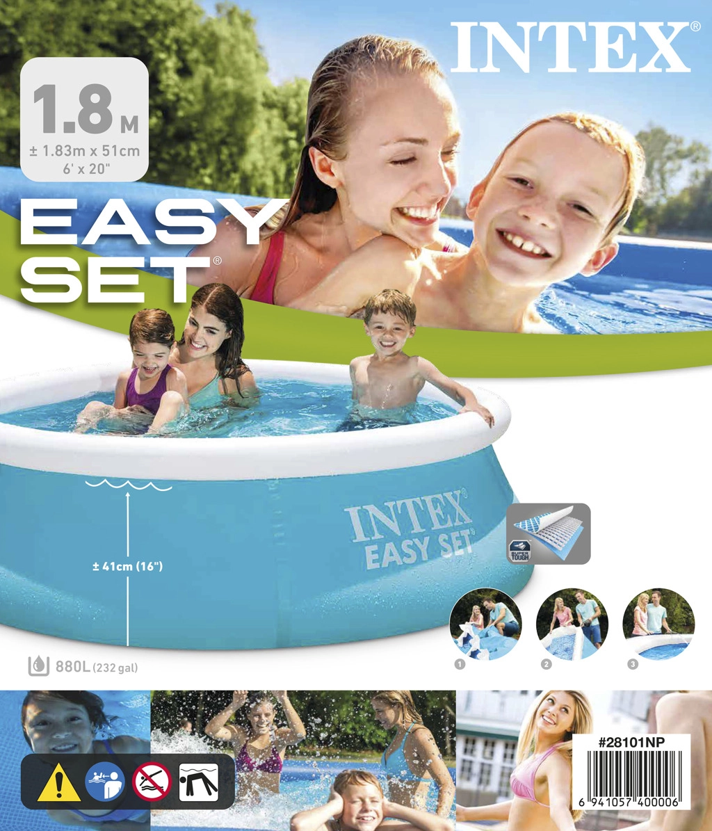 Selbsttragender Pool. Abmessungen 183 cm (oberer Umfang 145 cm) x 51 cm. Wasserstand 41 cm. Kapazität 900 l.