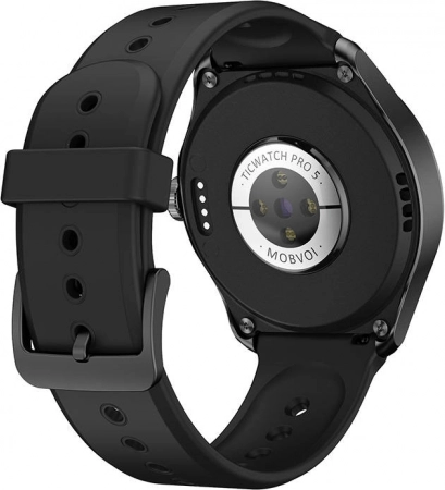 Die Mobvoi TicWatch Pro 5 bietet ein modernes Design mit einem robusten Gehäuse aus Metall und einem schwarzen Armband für komfortables Tragen.