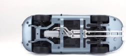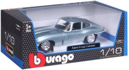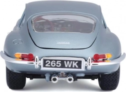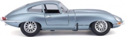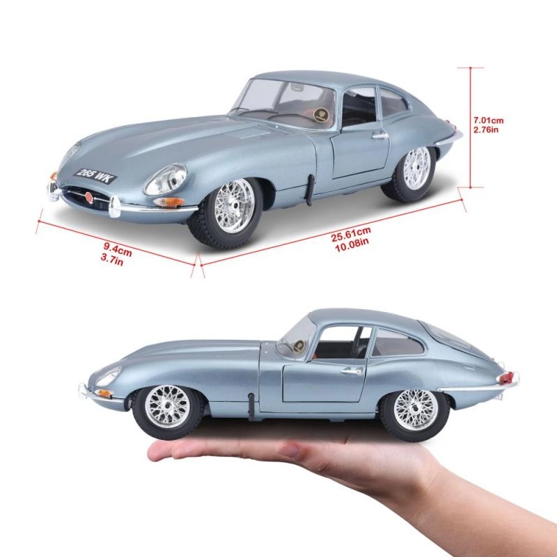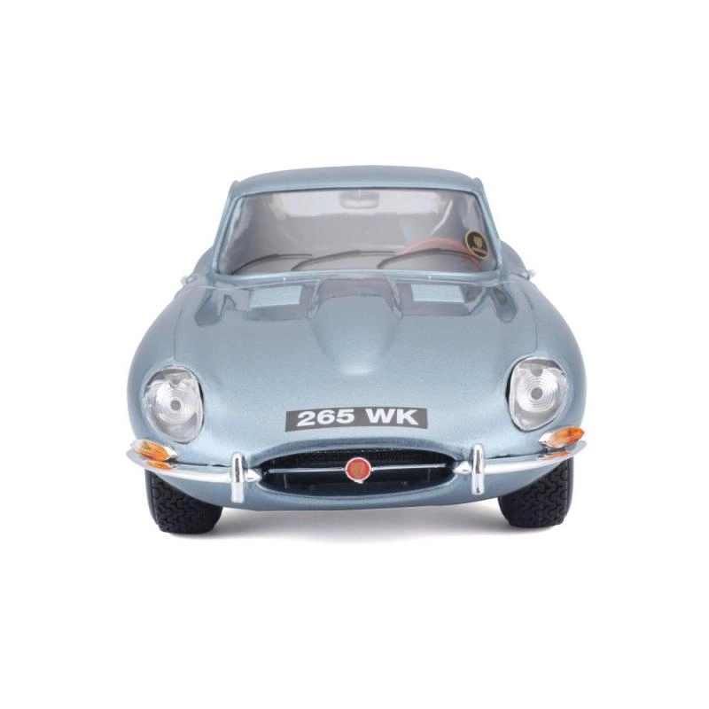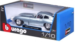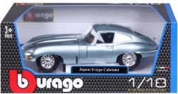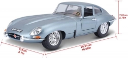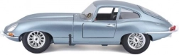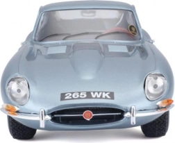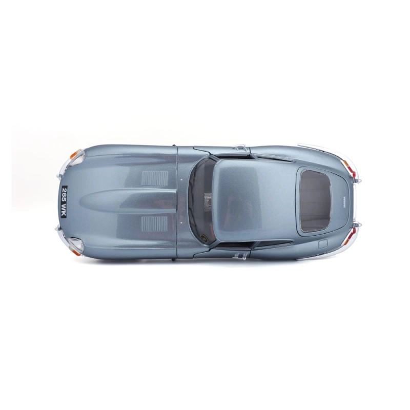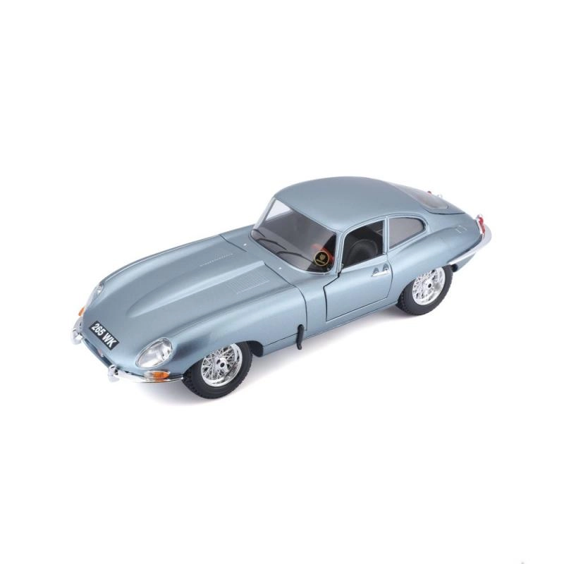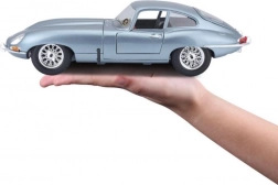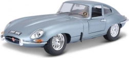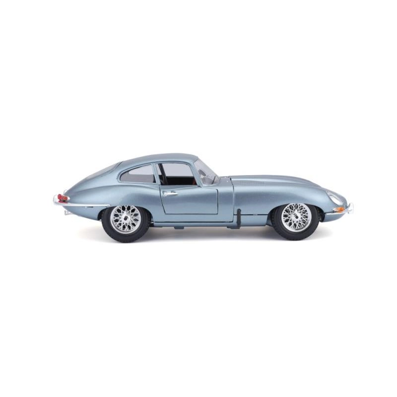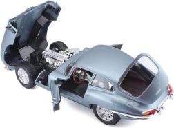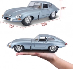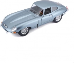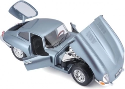 Metallmodellauto 1:18 Bburago 18-12044 Jaguar E-type Coupé nicht nur für Sammler. Es hat zu öffnende Türen und eine Motorhaube, die Räder lassen sich über das Lenkrad vollständig funktional lenken. Die Farbe des Modells ist silberblau metallic.