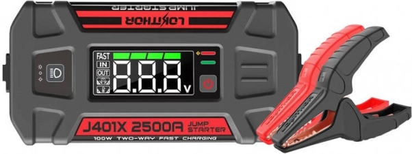 Die multifunktionale Starthilfe und Powerbank LOKITHOR J401X mit einer Leistung von 2500 A startet zuverlässig Benzinmotoren bis 8,5 l und Dieselmotoren bis 6,5 l. Sie ist kompatibel mit 12V-Fahrzeugen, bietet Schnellladen bis 100 W und eine integrierte LED-Taschenlampe mit drei Modi (SOS, Stroboskop, Dauerlicht). Kompakte Lösung für unterwegs für sicheres Starten und Stromversorgung Ihrer Geräte.