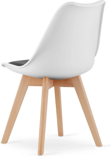 Die Stühle sind in Schwarz und Weiß mit Beinen in natürlicher Holzfarbe erhältlich.