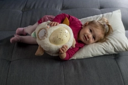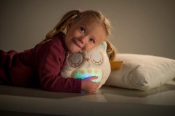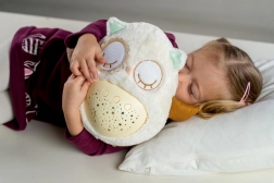 Dieses kuschelweiche Plüsch-Schlafkuscheltier verbindet wohlige Geborgenheit mit smarten Einschlaffunktionen. Die Eule projiziert einen Sternenhimmel in 8 Farben, spielt 8 Wiegenlieder sowie beruhigende pränatale Klänge, an die sich die Kleinsten aus Mamas Bauch erinnern. Nach dem Ende der Melodie leuchtet es noch etwa eine Minute sanft weiter und schaltet sich dann automatisch aus.