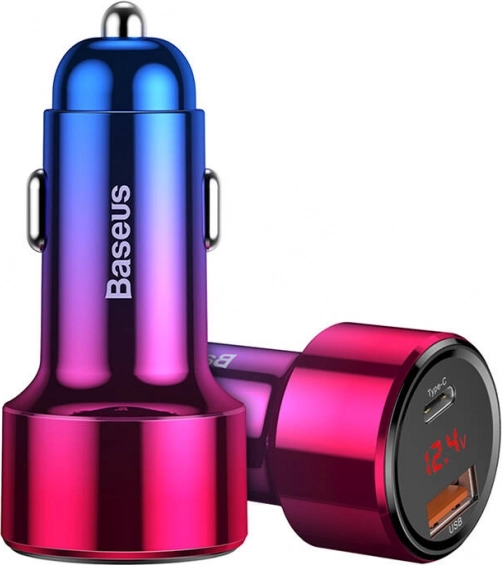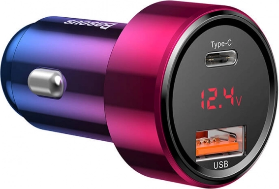 Das stilvolle rot-blaue BASEUS Magic Auto-Ladegerät passt sich intelligent den Anforderungen Ihres Geräts an und sorgt für schnelles und schonendes Laden während der Fahrt. Dank der Kombination aus USB‑C- und USB‑A-Port laden Sie problemlos zwei Geräte gleichzeitig – von Smartphones über Tablets bis hin zu Zubehör.