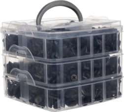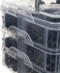 Praktische Box mit transparenten Etagen und Sicherungsverschlüssen hält die Clips übersichtlich und sicher. Einfacher Transport dank stabilem Tragegriff.