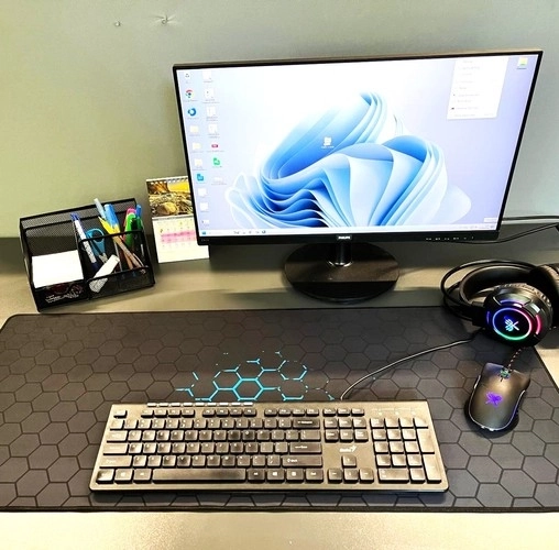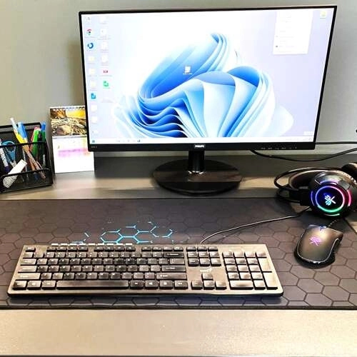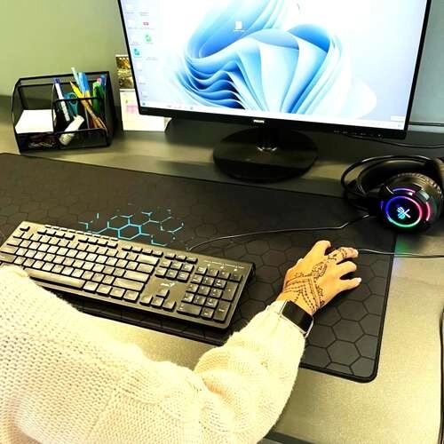 TISCHSCHUTZ UND STYLISCHES DESIGN- Die große Unterlage schützt den Tischvor Kratzern, Abrieb und weiteren Beschädigungen, die bei täglicher Nutzung entstehen können. Sie bewahrt die Tischoberfläche vor übermäßigem Verschleiß an stark beanspruchten Stellen.Das moderne Design und das „Waben“-Muster zeichnen sich durch einen zeitgemäßen, eleganten Look aus, der die Ästhetik Ihres Arbeitsplatzes oder Gaming-Setups aufwertet.