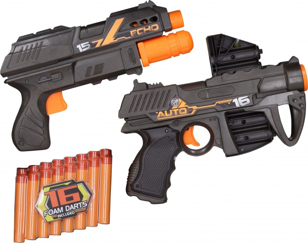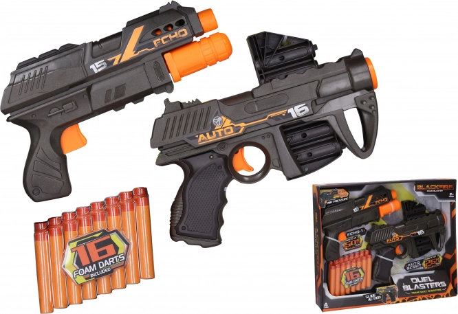Set aus zwei BLACKFIRE Schaumdart-Pistolen: Auto Scout und Echo-1. 16 Darts enthalten, Reichweite bis zu 15,2 m, einfache Bedienung. Länge 21 cm.