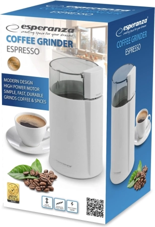 Neben Kaffee bewältigt die Mühle auch Gewürze, Samen und Nüsse und wird so zu einem praktischen Helfer in jeder Küche. Ihre kompakten Abmessungen und das elegante weiße Design passen in jedes Interieur und nehmen auf der Arbeitsfläche nur wenig Platz ein.