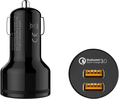 Ultraschnelles Auto-Ladegerät 2× USB mit QC 3.0, Leistung 36 W. Laden Sie bis zu 4× schneller, kompatibel mit 12–24 V, abwärtskompatibel mit QC 2.0/1.0.